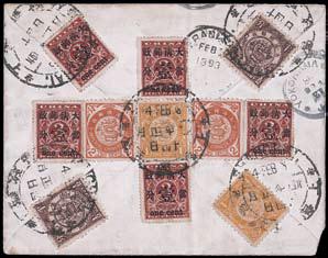 1898 (4 Feb.) Combination cover sent from Shanghai to Canada, f.w. on reverse 1897 Red Revenue Surch. 1c on 3c red x 5, ICP Coiling Dragons 1/2c x 2, 1c x 2 and 2c x 2, tied by fve strikes of SHANGHAI 4 FEB 98 dollar dater, YOKOHAMA JAPAN 12 FEB 98 transit cds, and Canada Feb. 1898 arrival cds alongside, on front with same Shanghai dollar cds, added with Japanese stamp 10s, tied by SHANGHAI I.J.P.O. 4 FEB 98 cds, with vertical folding crease and a bit dirty, nevertheless very scarce. Photo