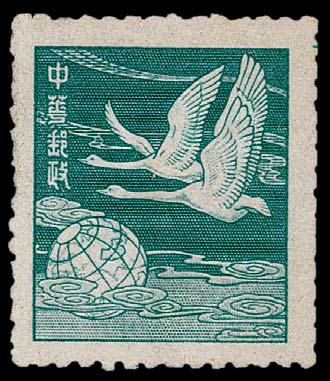 1949 Flying Geese, Dah Tung print, bluish green, without value, unused, no gum as issued, very fresh in colour and very fne. A superb example of this great rarity of Chinese philately with only six copies recorded to be in private hands. Photo