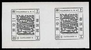 1866 Shanghai Large Dragon, modern numerals, CANDAREENS in the plural, wove paper, 2 Candareens, grey black, printing #70, horizontal pair, unused, very fne. (Chan LS33a, Livingston 40). Photo