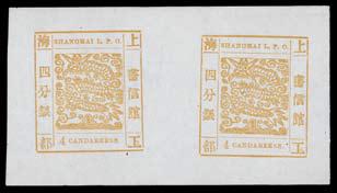 1866 Shanghai Large Dragon, modern numerals, CANDAREENS in the plural, wove paper, 4 Candareens, yellow, printing #72, horizontal pair, unused, very fne. (Chan LS35, Livingston 42). Photo