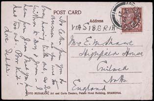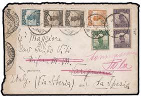 1929 (25 Mar.) cover sent to Italy via Siberia, f.w. on front 1st Peking Junk 1-1/2c x 2, 2nd Peking Junk 1/2c x 2, 1c, 2c and 3c, tied by Shanghai cds's, backstamped Pola 14.4.29 arrival cds, sealed with a censor label, tied by SPEZIA CENTRO EXPRESSI 12.4.29 cds's, light age toning. Photo