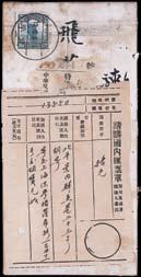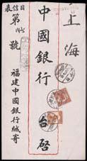 1929 (20 May) cover from Peiping to Shanghai, f.w. on reverse 2nd Peking Junk 10c, tied by PEIPING20.5.18 cds, affxed with a postal remittance receipt, on front with same Peiping cds and two Shanghai 25.5.18 arrival cds's, a rectangular registration handstamp alongside, also attached a registration receipt, with folding creases, both age toning. Photo