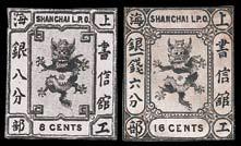 1876 Shanghai Local Post Small Dragon, 8 cents and 16 cents black die proof on think paper. Narrow margin close to the stamp design. Photo