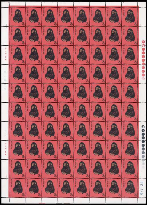 1980 Year of the Monkey (T46) 8f., complete sheet of 80, unfolded, unmounted mint, full original gum, with usual little black offset on back, few very light and hardly perceptible toning spots, still very fne and clean. Photo