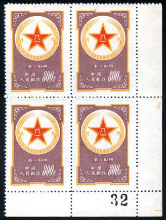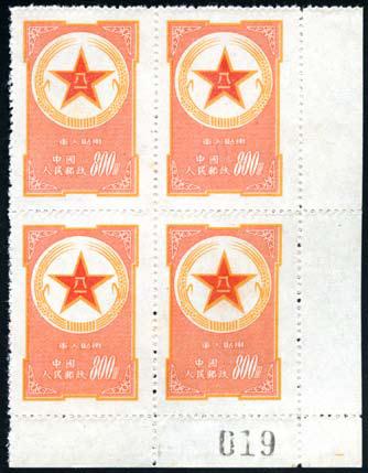 "1953 Military Postage stamps, $800 orange-yellow (Army) and $800 brown-purple (Air Force), both in lower right corner block of four, with sheet numbers of ""019"" and ""32"" respectively on margins, unused, no gum as issued, $800 Army with one barely invisible light toning spot on one stamp, $800 Air Force with one very light toning spot on one horizontal perforation and one on right margin, still very fne and very rare in multiples espeically with extremely early sheet numbers. Photo