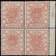 1878 Customs Large Dragon, thin paper, 3Cds. brown red, in block of 4 with right marginal paper, unmounted mint, original gum, very fne, scarce multiple. (Chan 2). Photo