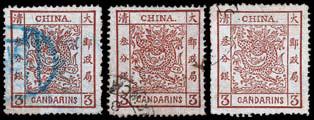 1882 Customs Large Dragon, wide margin, 3Cds. brown red x 3, all fne used. (Chan 5). Photo