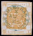 1865 (3 Aug.) Shanghai Large Dragon 3 Candareens yellow pelure paper printing # 9, tied by complete SHANGHAE/LOCAL POST/AU 3 65 index X cds in blue green, very early usage. With central diagonal crease, and light diagonal creases at bottom right. With 2009 Philatelic Foundation certifcate. Chan's LS3a. Photo
