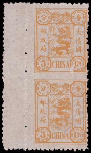 1894 Empress Dowager 1st print, 3Cds. orange yellow, vertical pair with left gutter margin, imperforate between variety, unmounted mint, full original gum, very fne and fresh, scarce. (Chan 24b). Photo