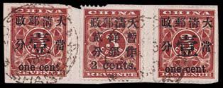 1897 Red Revenue Surch. with large characters of Chinese value, 1c on 3c red, mint, large part original gum, hinged, fne. (Chan 87). Photo