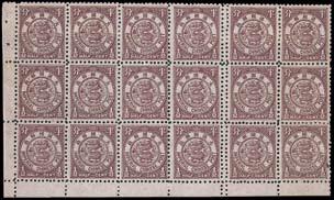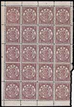 1897 ICP Coiling Dragon, 1/2c brown, complete left pane of 20 (4 x 5) in the sheet, with selvedges on 4 sides (except on two stamps at right), unmounted mint, full original gum, very fresh & very fne. (Chan 92). Photo