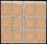 1897 ICP Coiling Dragon, 1c golden yellow, block of 10 (2 x 5) with selvedges on 3 sides, block of 12 (2 x 3 + 2 x 3), with top and in between gutter margins, and block of 15 (3 x 5) with top & bottom margins, mint, full original gum, mostly cracked, hinged, some perforation separation and rejoined with hinges, still fresh on front. (Total 37 stamps). (Chan 93). Photo