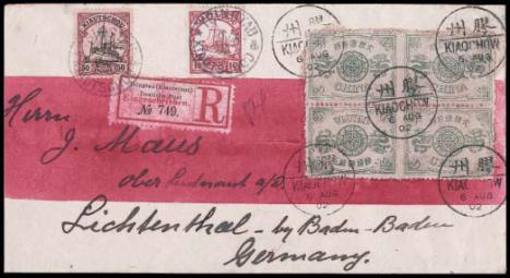 German Kiaochow 10pf. and 50pf. tied by Tsingtau c.d.s., registered to Lichtenthal with arrival backstamp. A very rare