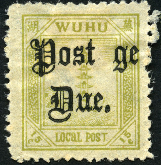 1895 Wuhu Local Post opt. 'Postage Due' on 1st issue 15c olive green with 'a' of 'Postage' omitted variety, no gum and hinged remnant. Chan LWD9c.