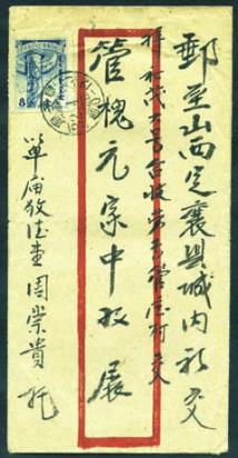 1940's A cover with opt. in char. 'Temporarily Sold' $3 on 8c Oliver green SYS Dah Tung print, tied by faint bilingual 'SHANGHAI'