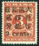 1897 Small figures surcharged 2c on 3c, with inverted 's' of 'cents' variety, mint and no gum. Chan 84h. Photo