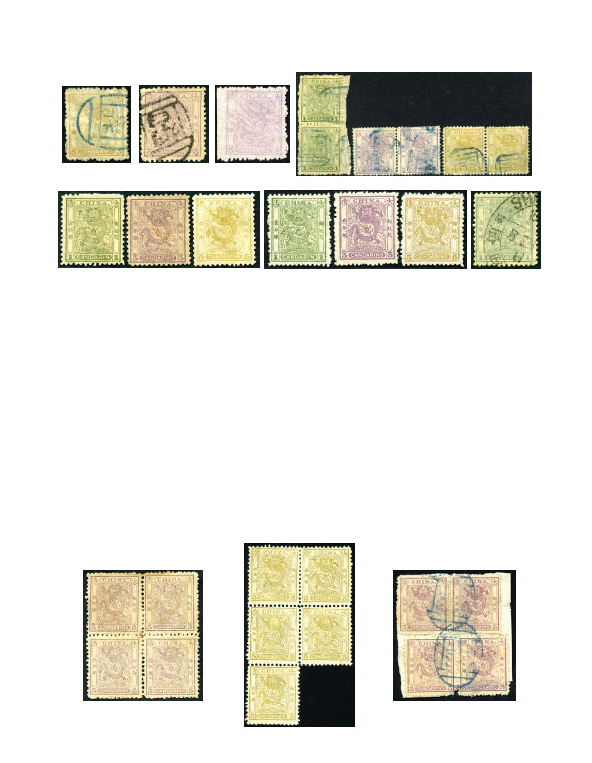 1885 Small Dragon perf. 12 1/2, 3 cands and 5 cands horizontal pair, and 1 cand vertical pair, both used, 1 cand toned. Chan 17-9.