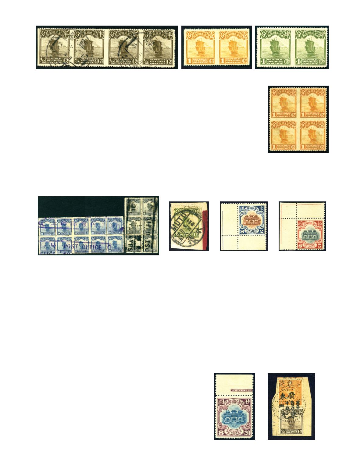 1923 Second Peking print Junk, 4c grey block of 6 and 10c blue block of 10, all tied by bilingual 'POST OFFICE SHANGHAI'